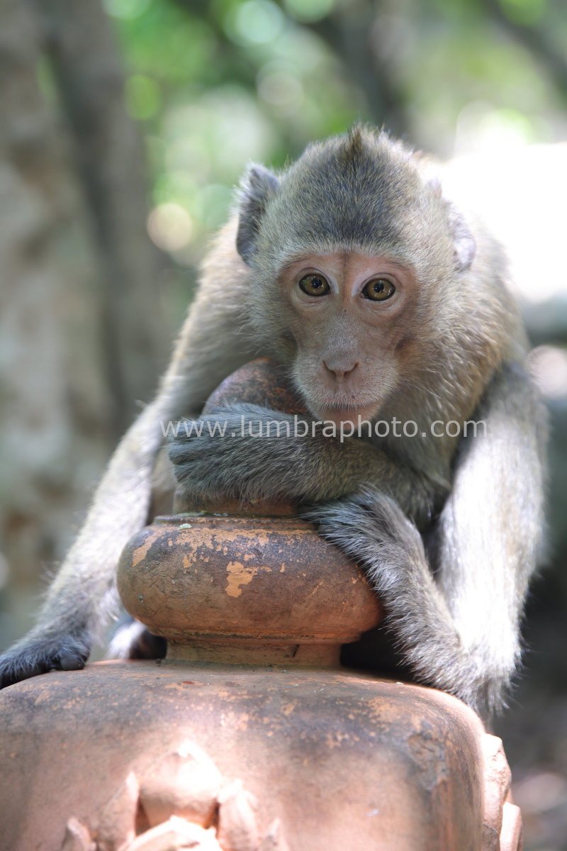 A cute temple monkey posing for the camera on the stairs of the shrine of King Sisowath at Oudong Mountain. Oudong Mountain was the capital of Cambodia from 1618 to 1866 and then moved to Phnom Penh in 1866.